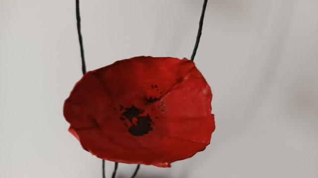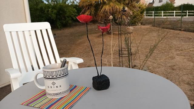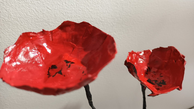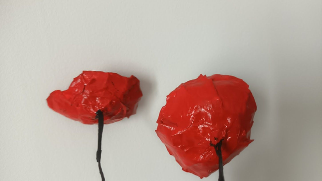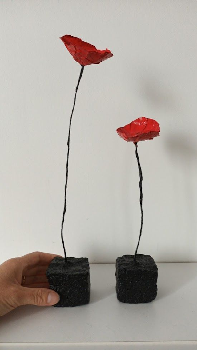 Le papier mâché est recouvert d'une peinture acrylique noire pour la tige, et rouge pour la fleur. L'ensemble est verni pour sa protection et longévité.