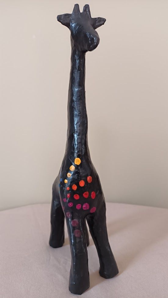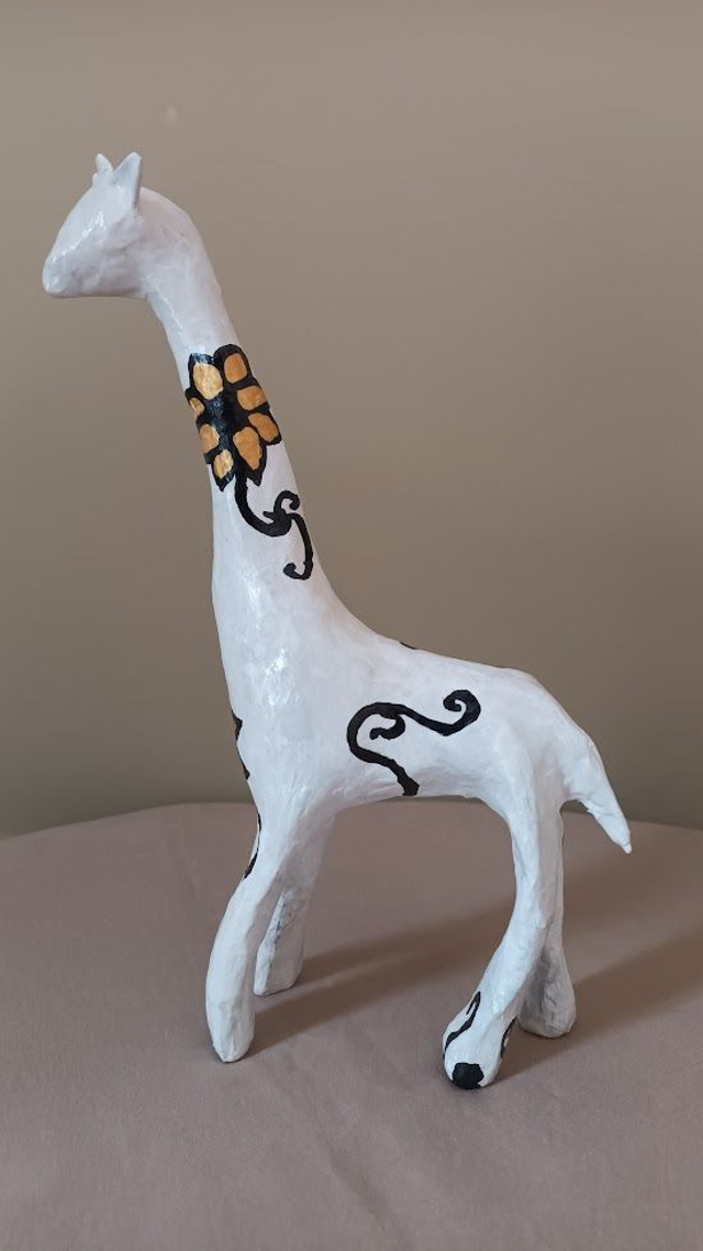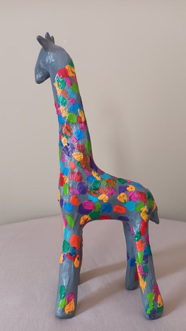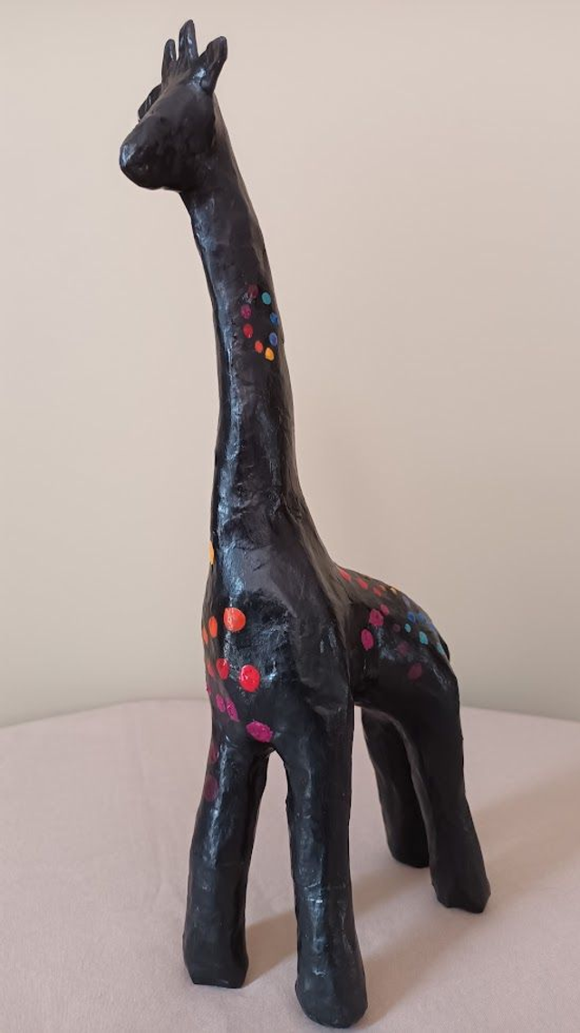 Le papier mâché est recouvert d'une peinture acrylique puis d'un vernis pour le protéger et sa longévité.